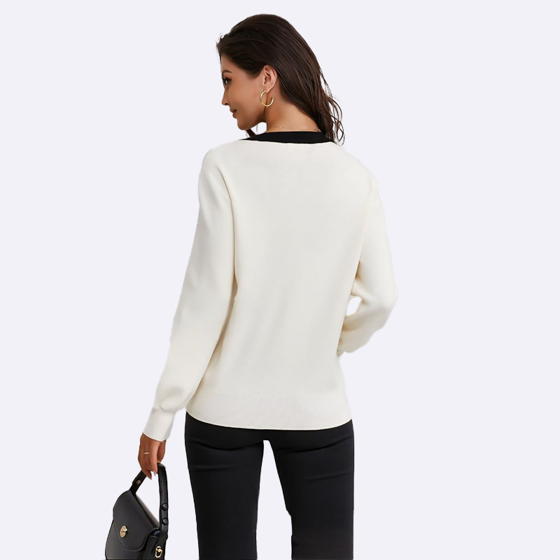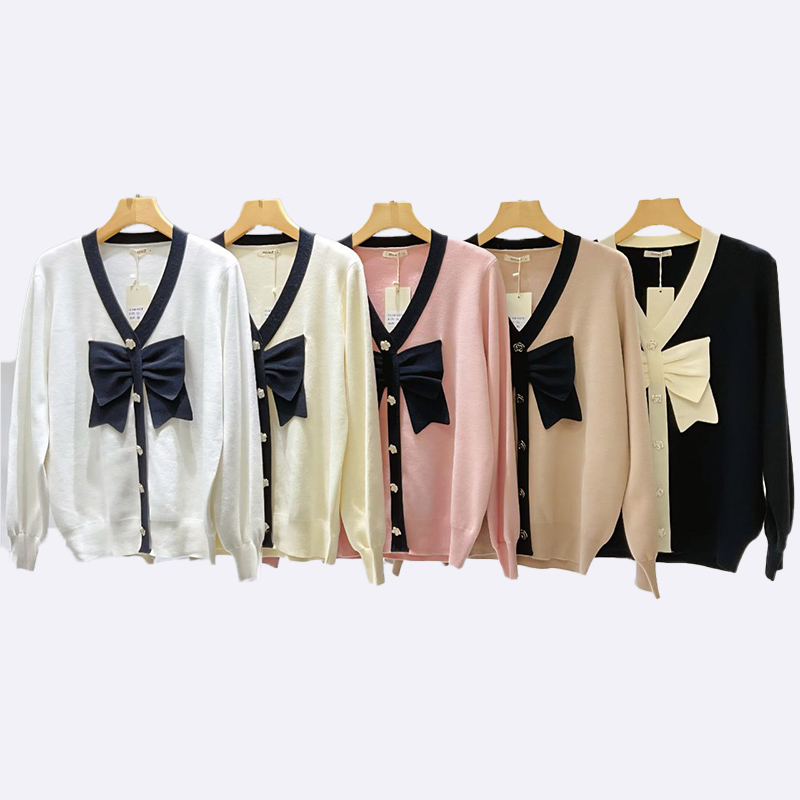 كارديغان نسائي أنيق برقبة على شكل V، باللون الأبيض مع حواف وأزرار سوداء، مزين بفيونكة سوداء كبيرة على الصدر وأزرار على شكل زهور بيضاء.