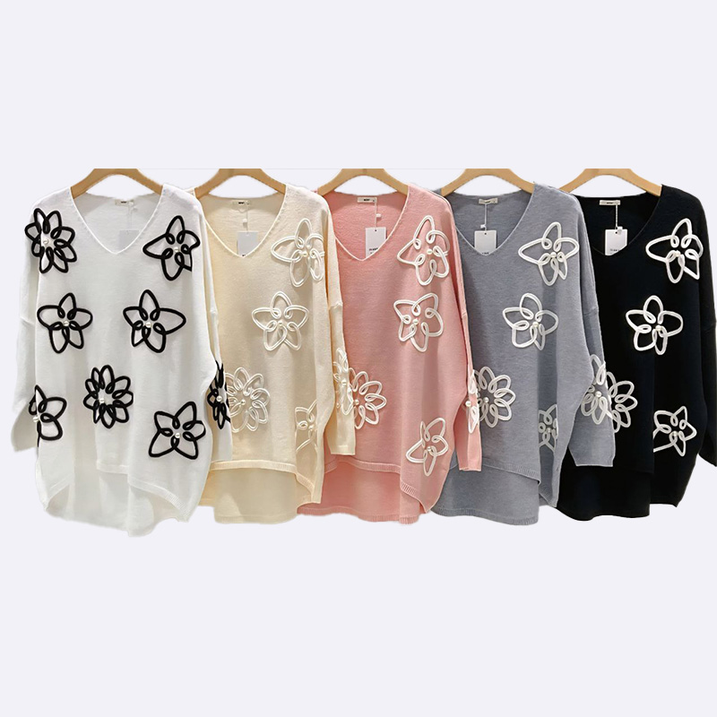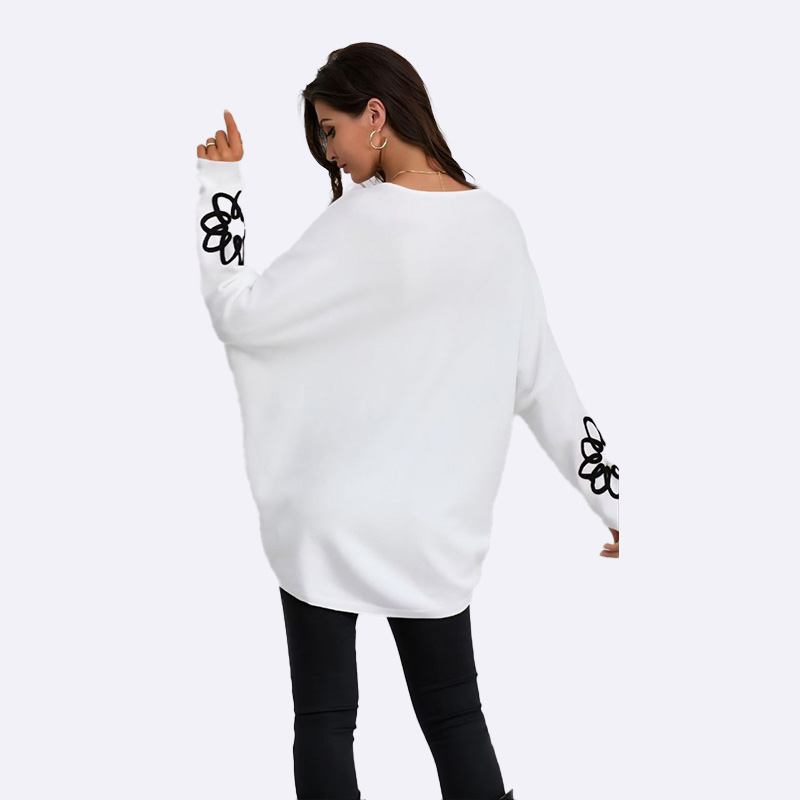 كنزة نسائية بيضاء واسعة (Oversized) برقبة على شكل V، مزينة بزخارف نافرة على شكل ورود سوداء لتصميم عصري وفني ومريح.