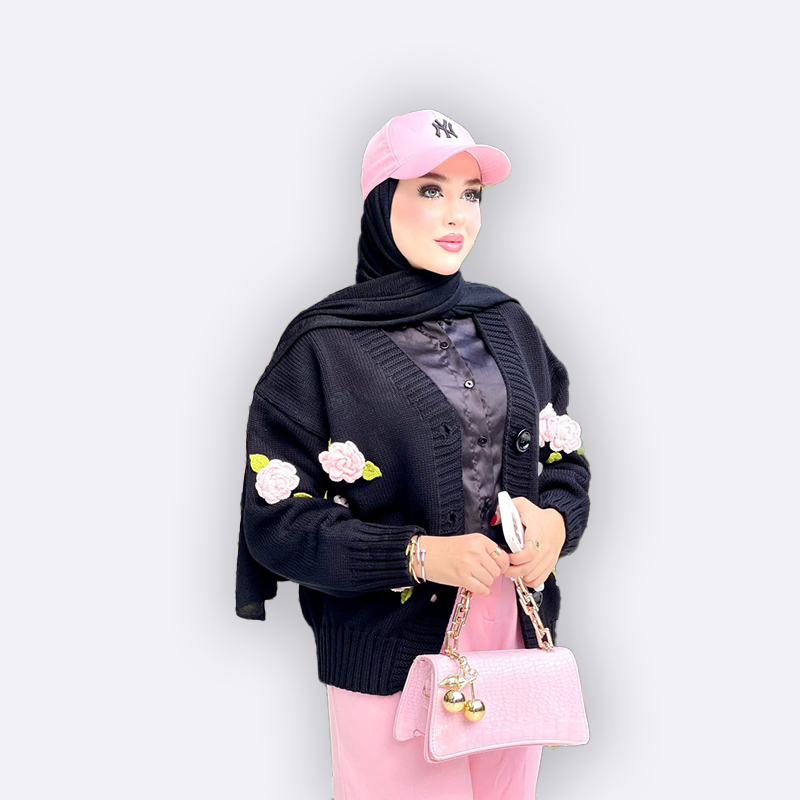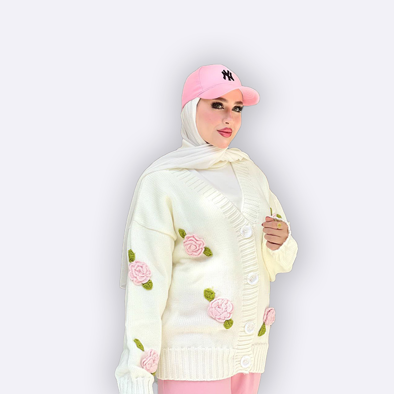 كارديغان محبوك مفتوح بياقة على شكل حرف V، يتميز بنسيج مريح ومرصع بزهور كروشيه ثلاثية الأبعاد بارزة على الجهة الأمامية والأكمام، ومزود بأزرار، وهو مناسب للإطلالات الكاجوال العصرية.