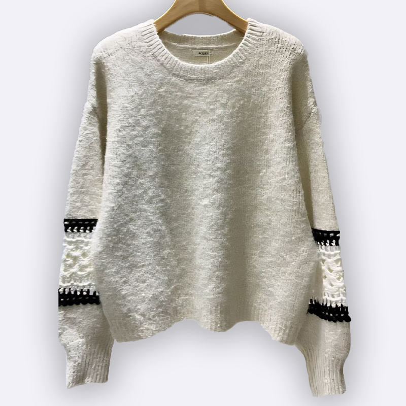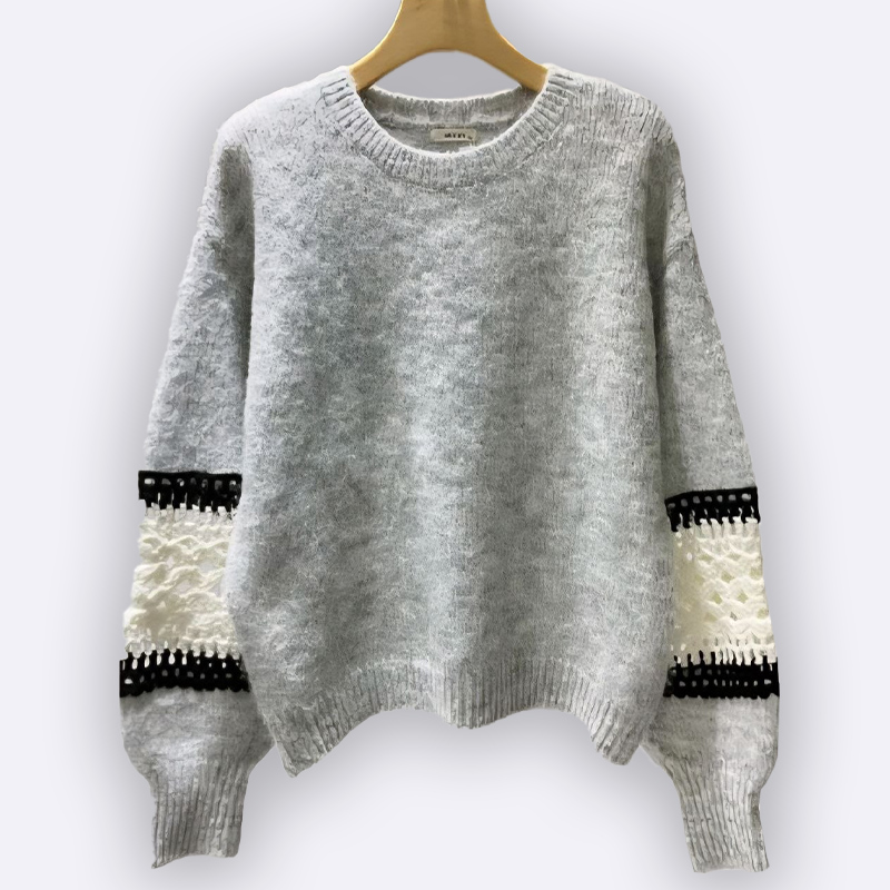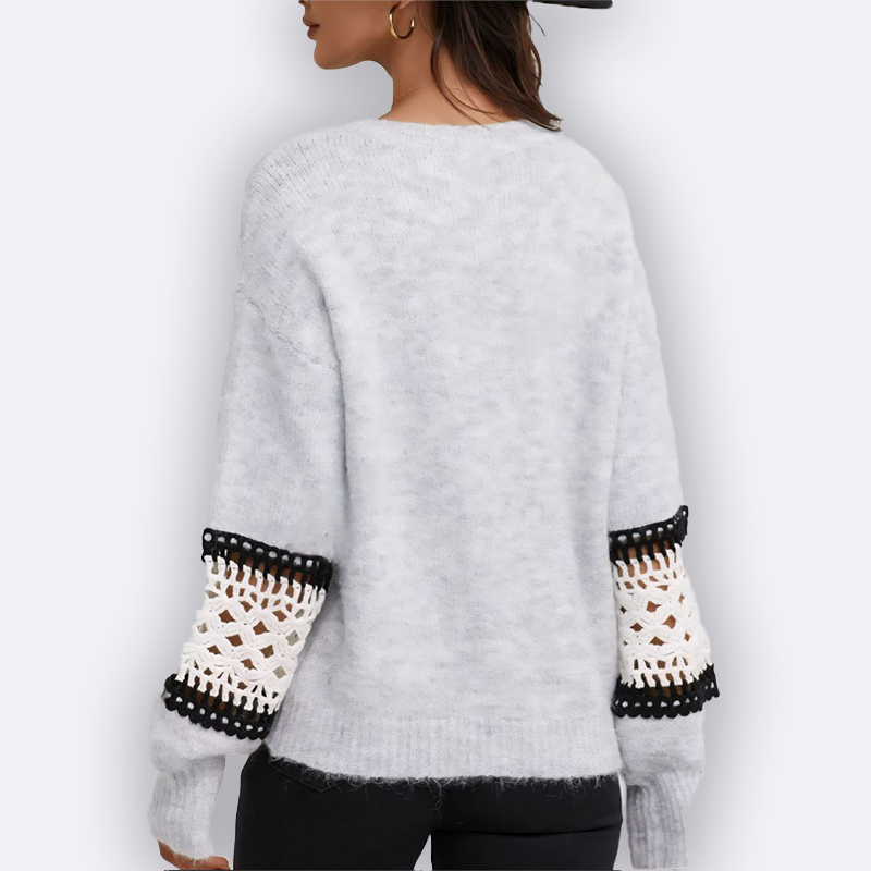 كنزة صوفية محبوكة بياقة مستديرة وتصميم مريح، تتميز بأكمام طويلة مزينة بقطعة كروشيه شبكية مفتوحة عند المعصم، مما يمنحها لمسة عصرية وفنية، ومناسبة للإطلالات الشتوية والربيعية.