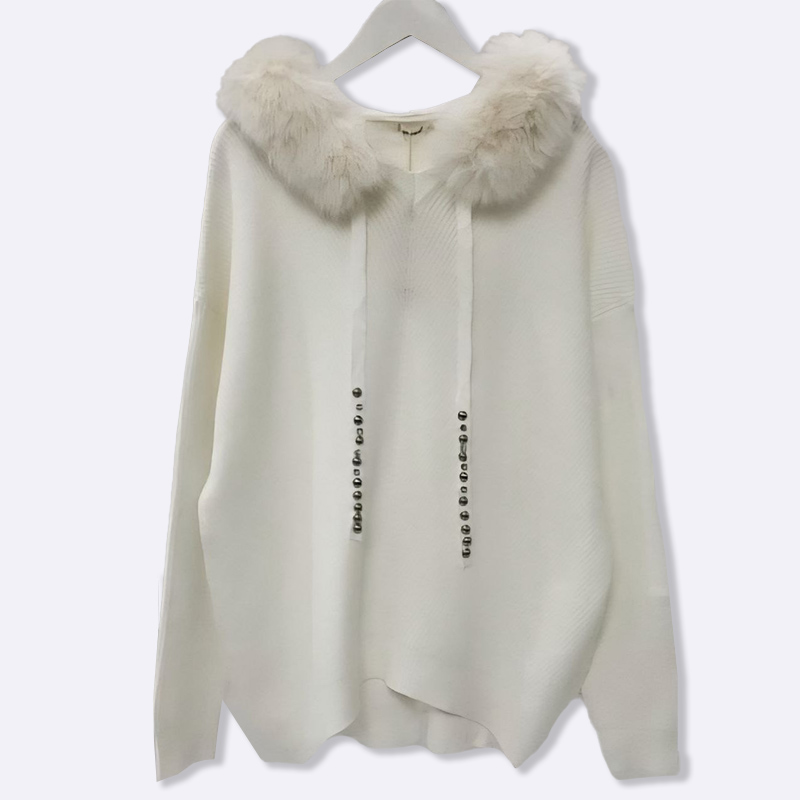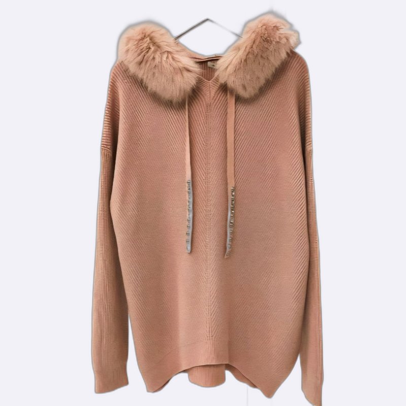 استمتعي بالدفء والأناقة مع هذه الكنزة المحبوكة بغطاء رأس من الفرو. تصميم عصري ومريح يضفي لمسة جمالية على إطلالتك الشتوية.