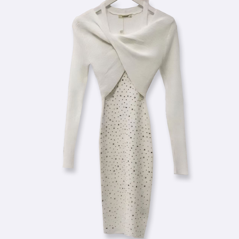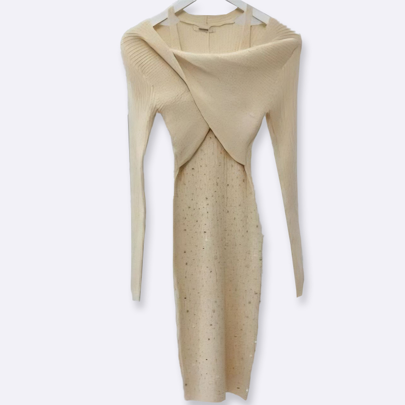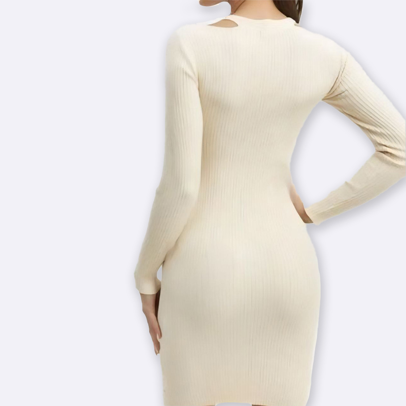 تألقي بإطلالة جذابة مع هذا الفستان الضيق المحبوك. يتميز بتصميم ملتوي أنيق وياقة مفتوحة، بالإضافة إلى زخرفة رقيقة تضفي لمسة من الأنوثة.