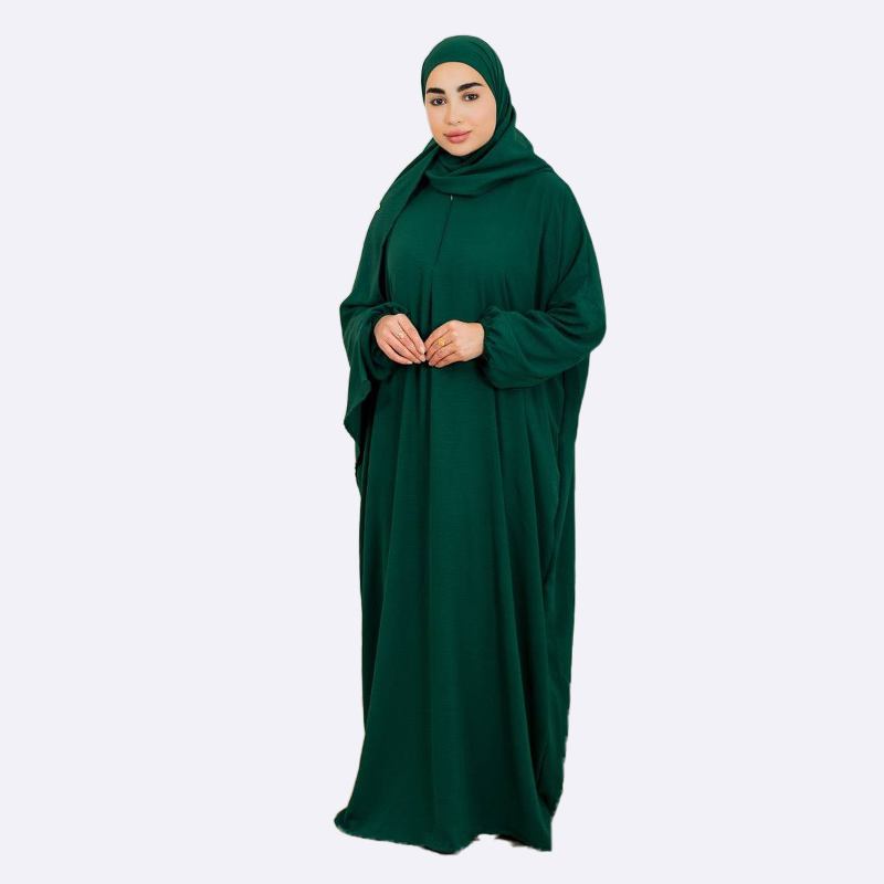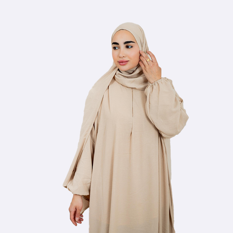 عباية فضفاضة ومريحة من قماش ذي ملمس منسوج، تأتي مع شال مطابق، وتتميز بأكمام واسعة وأساور مطاطية لتغطية كاملة وأنيقة.