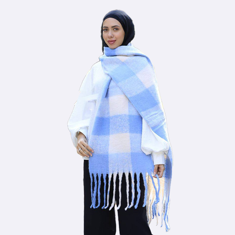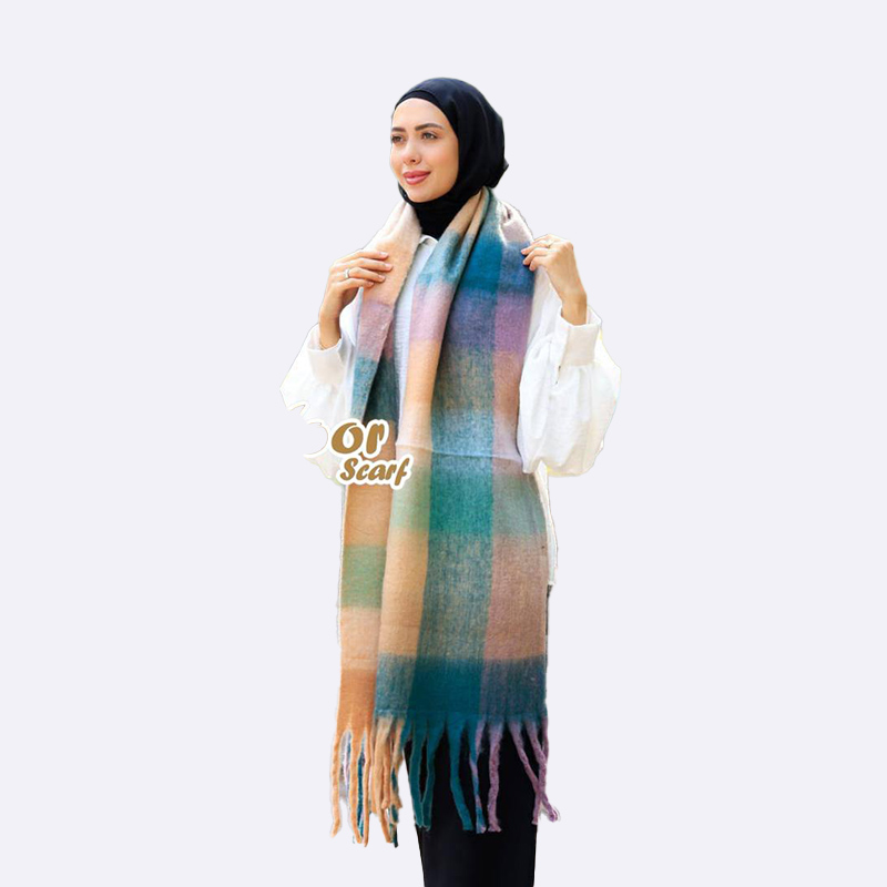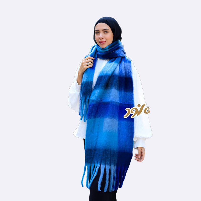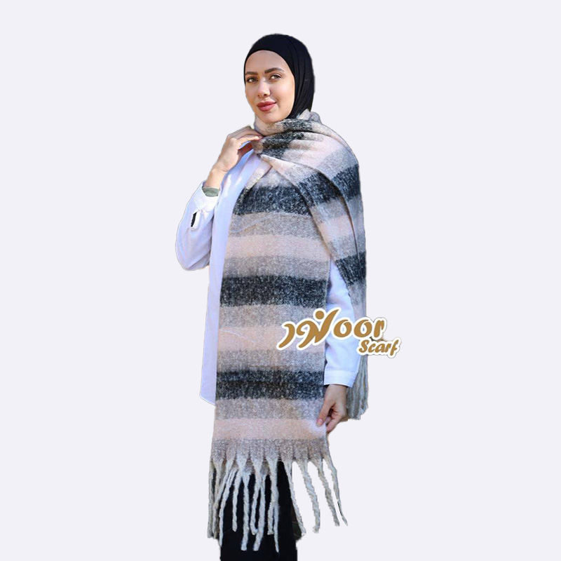 شال شتوي طويل وفائق النعومة من نسيج الموهير الممشط، يتميز بنقشة كاروهات (مربعات) وأهداب عند الأطراف، يوفر دفئاً كبيراً ومناسب للالتفاف حول العنق والأكتاف.