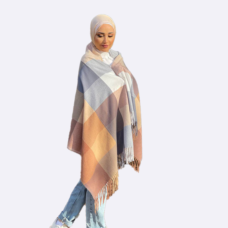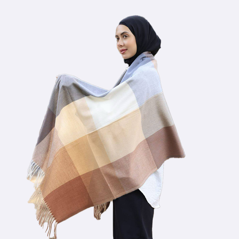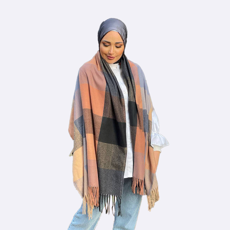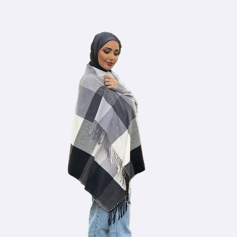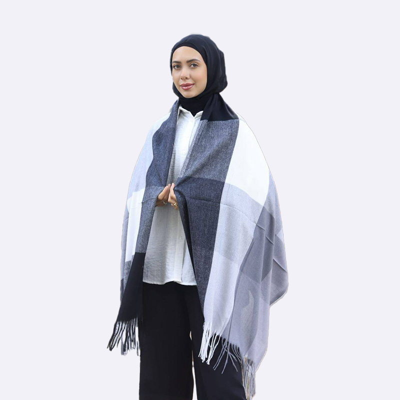 شال شتوي طويل وفائق النعومة من نسيج الموهير الممشط، يتميز بنقشة كاروهات (مربعات) وأهداب عند الأطراف، يوفر دفئاً كبيراً ومناسب للالتفاف حول العنق والأكتاف.