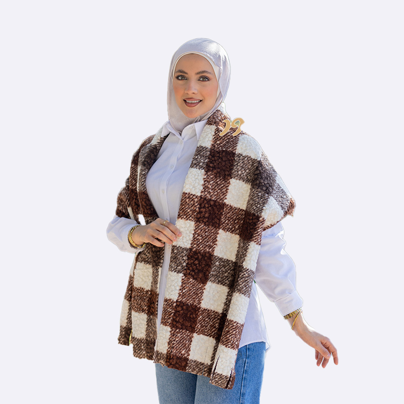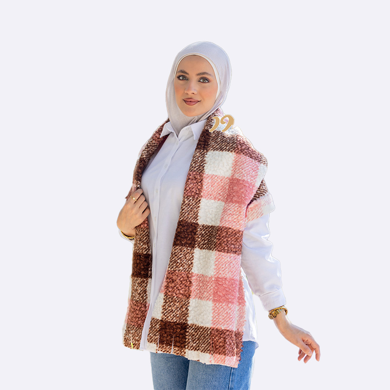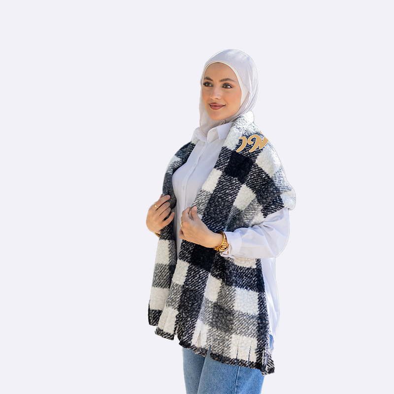 شال سميك ودافئ يتميز بنسيج "البوكليه" أو الفرو الصناعي الناعم بنمط تيدي، مع نقشة مربعات (كاروهات) كبيرة، ويستخدم كإكسسوار للملابس الخارجية.