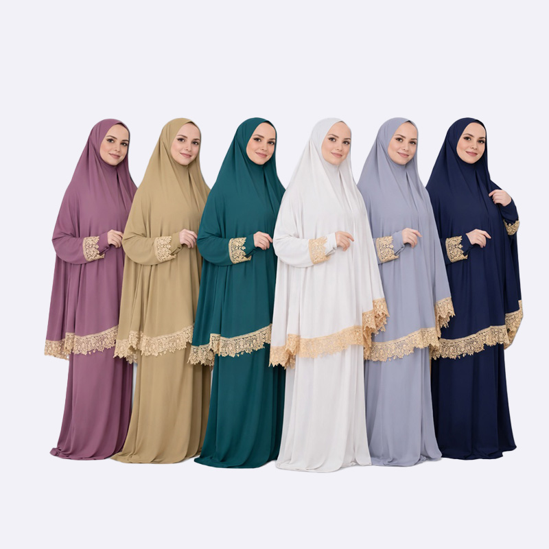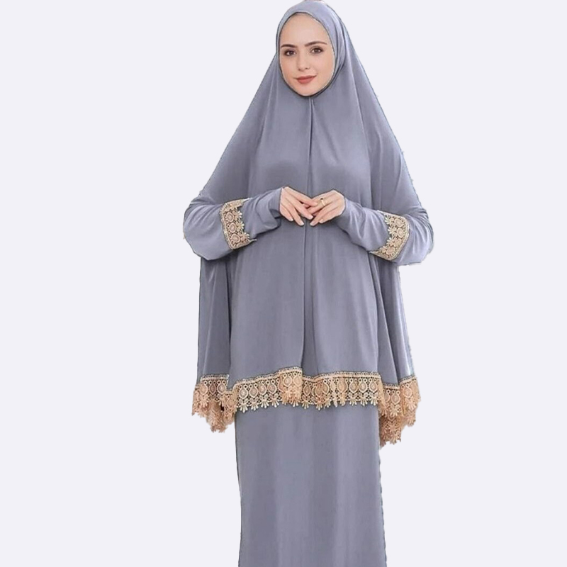 استمتعي بالصلاة بأناقة مع طقم الصلاة الرائع هذا. يتميز بتصميم مريح وعصري مع حواف دانتيل أنيقة وحجاب متصل لسهولة الارتداء.