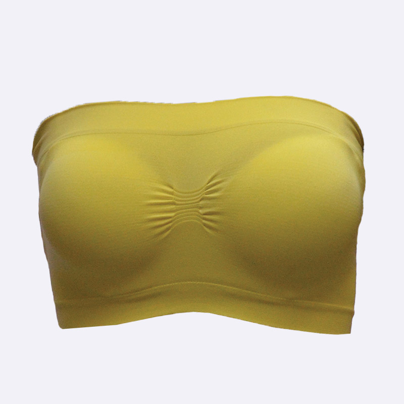 حمالة صدر نسائية بدون حمالات (باندو) باللون الأصفر، تتميز بتصميم بدون درزات يوفر الراحة والدعم الخفيف، مثالية للارتداء تحت الملابس ذات الأكتاف المكشوفة.