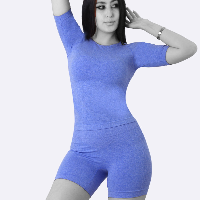 طقم رياضي نسائي باللون الأزرق المائل للبنفسجي، مكون من تي شيرت ضيق بنصف كم وشورت ضيق لركوب الدراجات (بايكر شورت)، بخامة مضلعة ومرنة بدون درزات، مثالي للتمارين الرياضية أو اللياقة البدنية