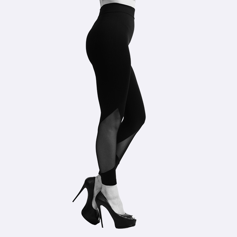 بنطلون نسائي طويل ضيق (ليجنز) باللون الأسود، يتميز بفتحة شبكية شفافة على شكل حرف V عند الكاحل، مما يضيف لمسة عصرية وأنيقة ومناسب للارتداء اليومي أو للتمارين الخفيفة.