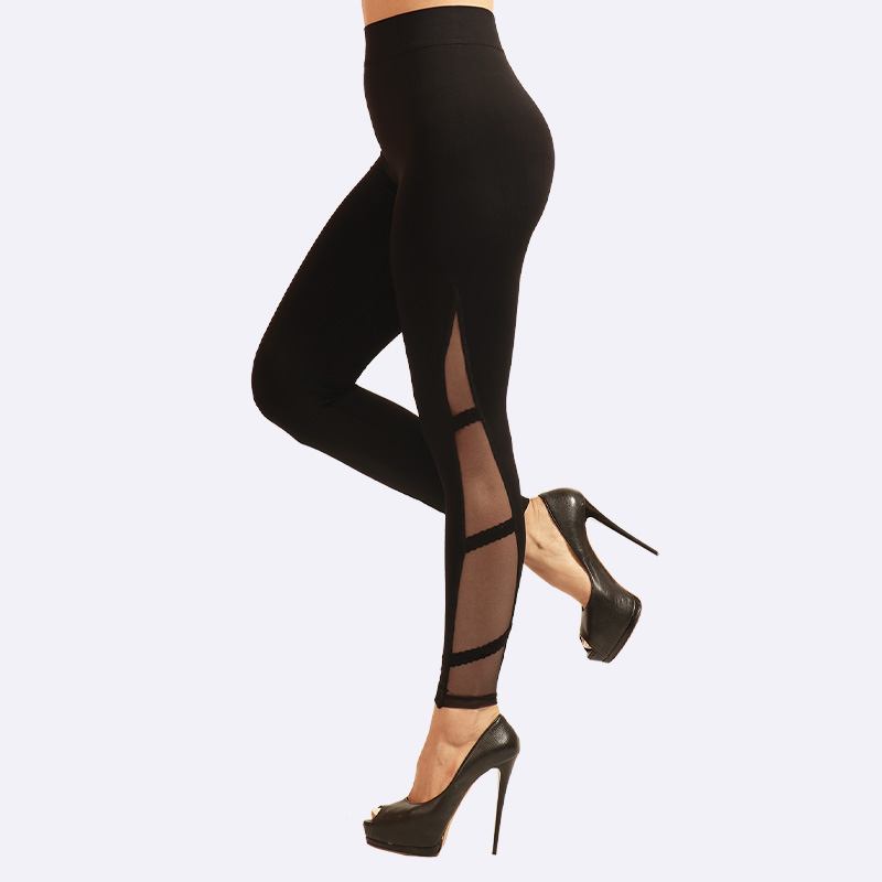 بنطلون نسائي طويل ضيق (ليجنز) باللون الأسود، يتميز بفتحات شبكية شفافة مقطوعة بشكل عصري على الجانب الخارجي من أسفل الساق، مثالي للإطلالات العصرية والرياضة.