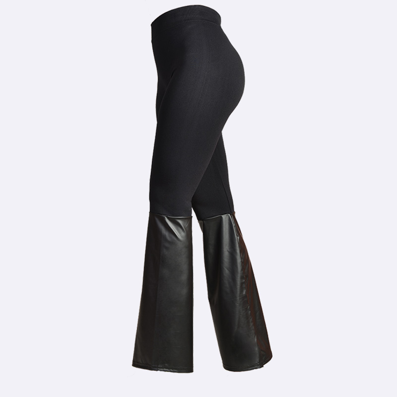 ليقنز أسود بخصر عالٍ، يتميز بقصة ضيقة من الأعلى تتسع عند الكاحل مع إضافة جزء من الجلد الصناعي لإطلالة عصرية ومميزة.