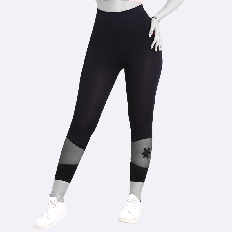 ليقنز رياضي قصير (كابري) باللون الأسود، يتميز بفتحات شبكية (شيفون) شفافة عند أسفل الساق مع نقشة زهرة.