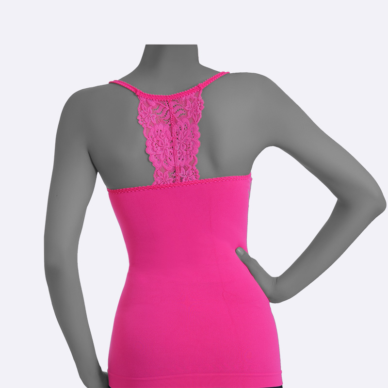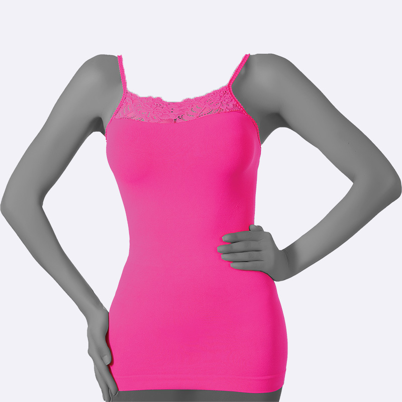 توب بروتيل بلون فوشيا ساطع بأحزمة كتف رفيعة، يتميز بقطعة دانتيل مزخرفة عند خط العنق، مناسب للارتداء تحت الملابس أو كقطعة أساسية.