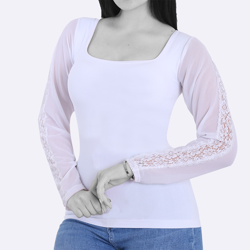 توب داخلي (فانيلة/كازوزنة) بكم طويل ورقبة مربعة (Square Neck)، يتميز بأكمام من قماش الشيفون الشفاف مع إضافة شريط من الدانتيل عند المعصم.