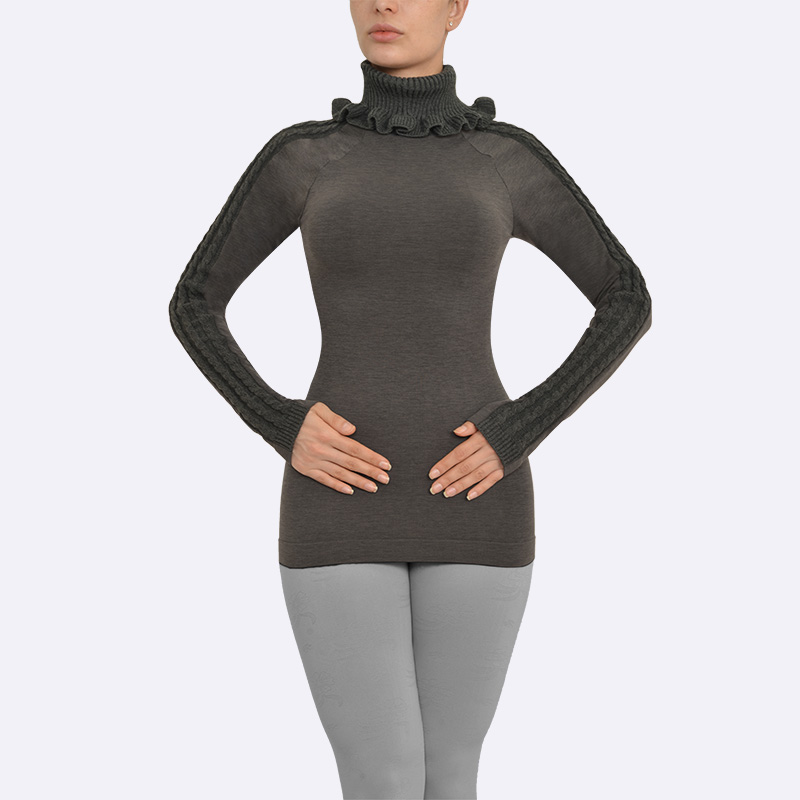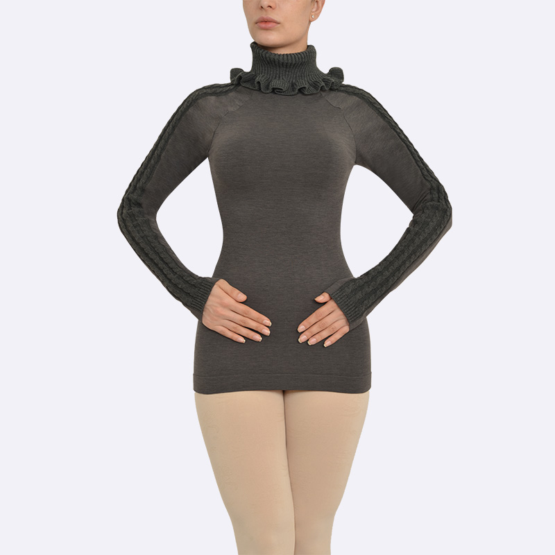 توب شتوي بكم طويل ولون رمادي داكن، يتميز بياقة عالية مكشكشة وأكمام محبوكة بنقشة الضفيرة، يوفر الدفء والأناقة في الطقس البارد