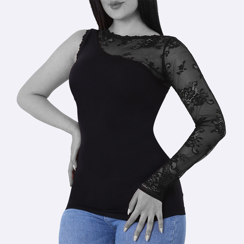 توب أسود ضيق بكم واحد طويل مصنوع من الدانتيل الشبكي والمطرز، والكتف الآخر مكشوف، مما يعطيه إطلالة مميزة للسهرات