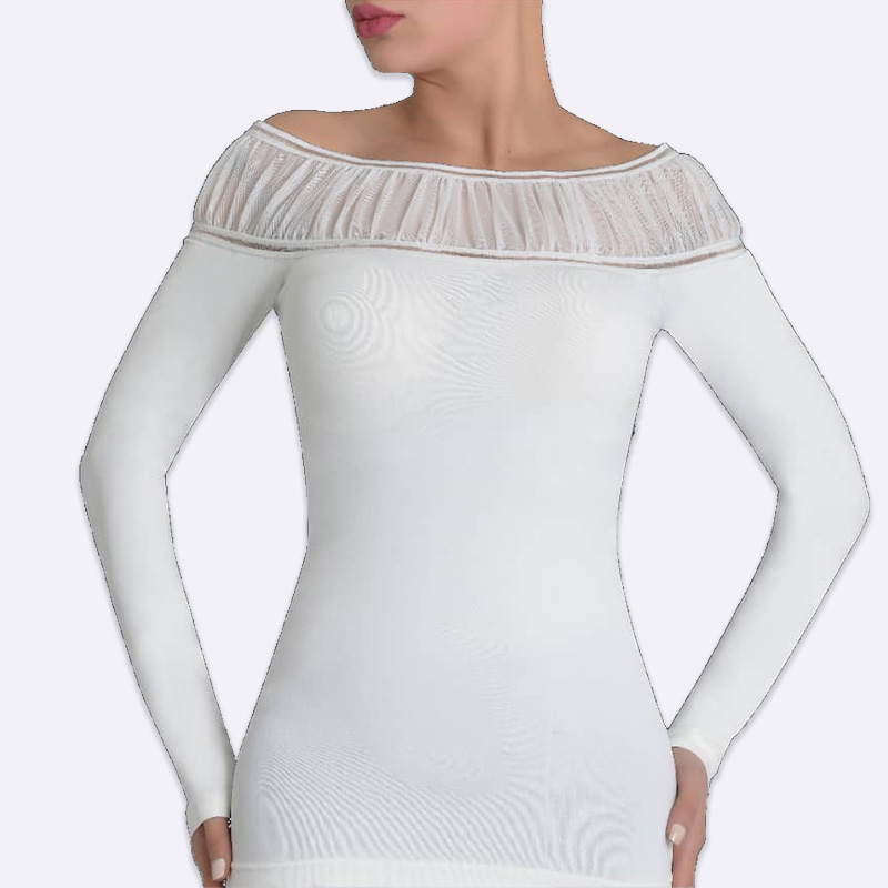 توب نسائي بأكمام طويلة ولون أبيض، يتميز بياقة عريضة وواسعة منسدلة على الأكتاف (Off-Shoulder)، مزينة بكشكشة من قماش الشبك أو الشيفون الشفاف المضلع.