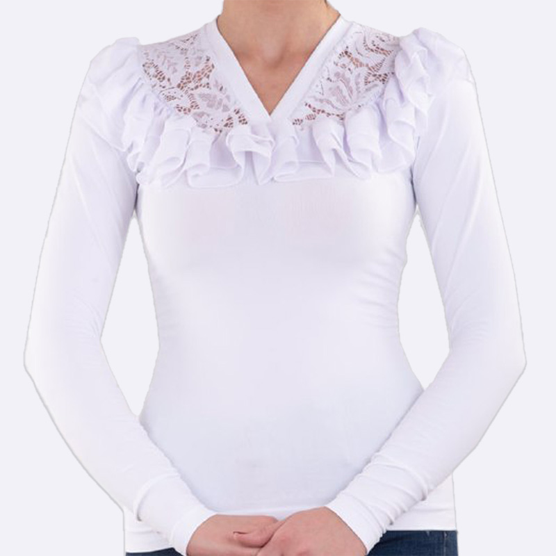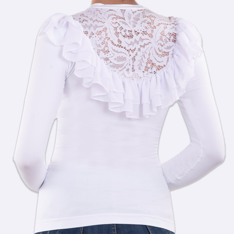 توب أبيض بكم طويل ورقبة على شكل حرف V، مزين بكشكشة عريضة وقطع من الدانتيل حول الياقة، تمتد هذه الزينة على الأمام وربما الخلف أيضًا، مما يمنحه مظهراً أنثوياً ورومانسياً.