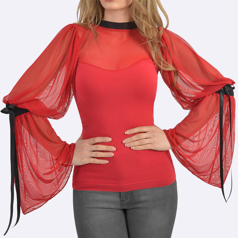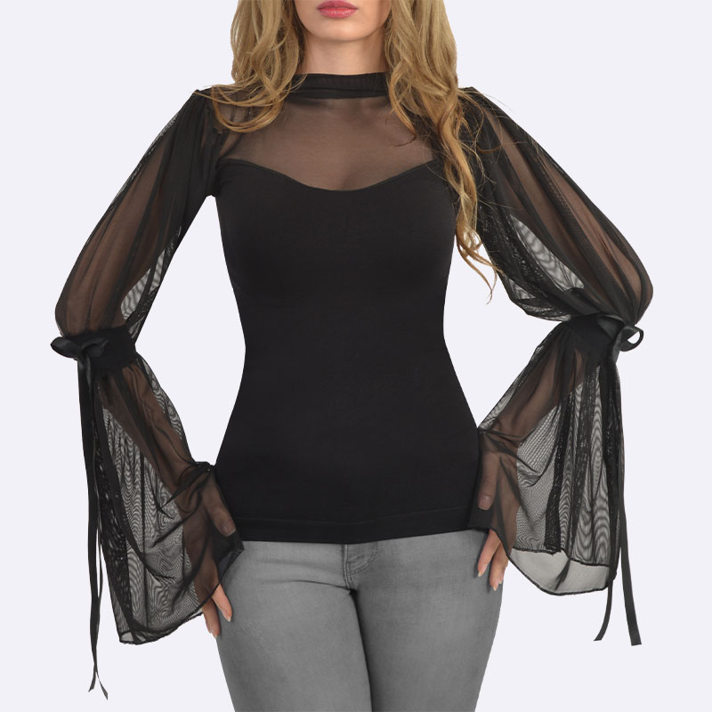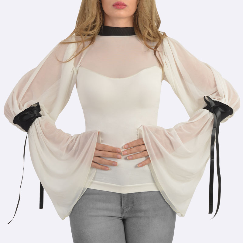 توب نسائي داخلي (كازوزنة) بدون أكمام (حفر)، يتميز بقطعة من الدانتيل المخرّم عند منطقة الياقة والكتفين، مناسب للارتداء تحت الملابس الشفافة أو كقطعة أساسية