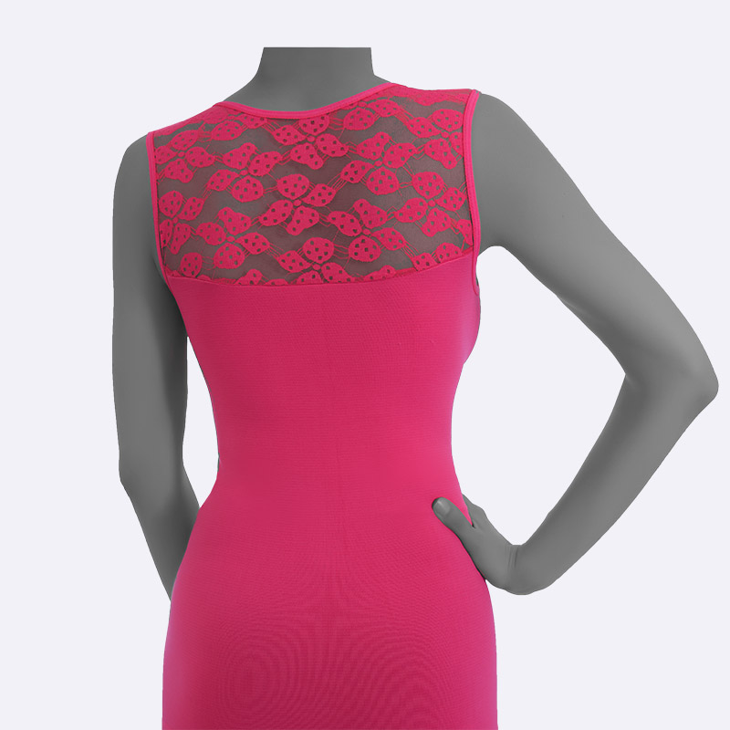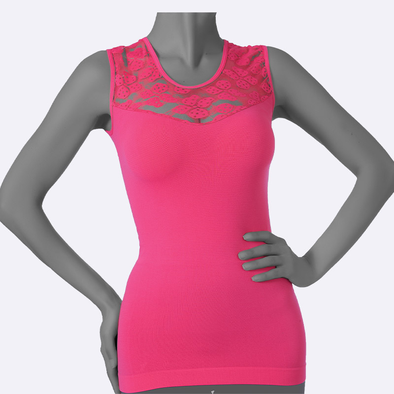 توب داخلي (كازوزنة) بدون أكمام (حفر) بلون فوشيا ساطع، يتميز بياقة شبكية شفافة مزينة بتفاصيل دانتيل أو تطريز على شكل فراشات، مناسب للارتداء تحت الملابس الشفافة أو كقطعة رياضية.