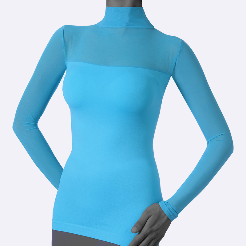 توب داخلي (كازوزنة) بلون أزرق سماوي، بأكمام طويلة وياقة عالية، يتميز بقطعة شيفون أو شبك شفاف تغطي الياقة والكتفين والصدر، مما يجعله مثالياً للارتداء تحت الملابس.