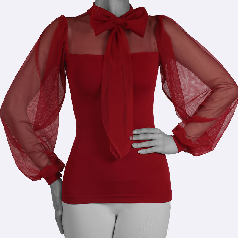 توب نسائي أحمر بأكمام طويلة منفوشة وشفافة من الشيفون أو التول، ويتميز بياقة عالية على شكل فيونكة (Pussybow/Papillon) يتم ربطها حول الرقبة، مما يمنحه إطلالة درامية وأنيقة.