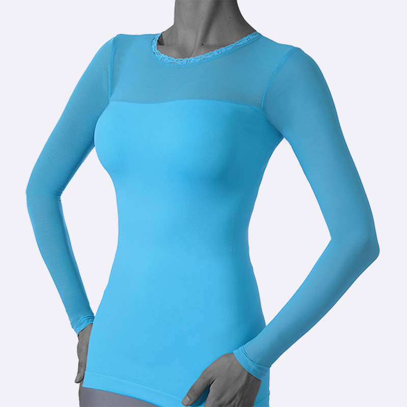 توب داخلي (كازوزنة) بأكمام طويلة ولون أزرق سماوي، يتميز بياقة دائرية (Round Neck) وأكتاف مصنوعة من الشيفون أو الشبك الشفاف، مع تفاصيل دانتيل بسيطة على حافة الياقة، مثالي للارتداء تحت الملابس.