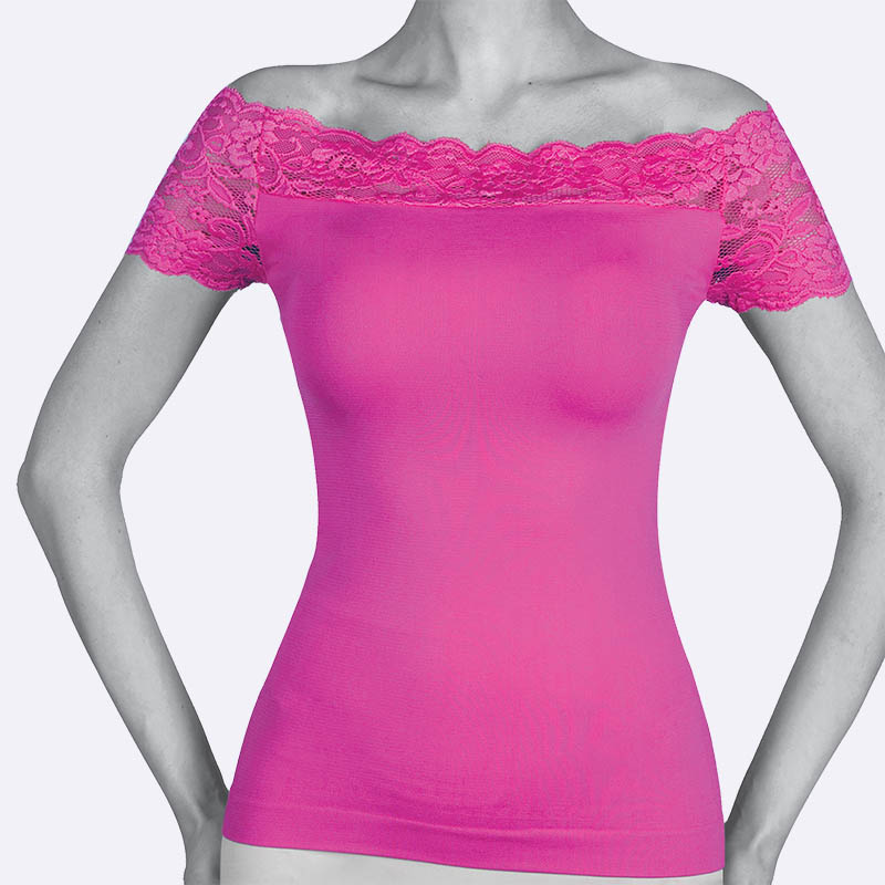 توب نسائي بلون فوشيا ساطع، يتميز بياقة واسعة منسدلة على الأكتاف (Off-Shoulder) وأكمام قصيرة (ربع كم/Cap Sleeve) مصنوعة بالكامل من الدانتيل المشغول.