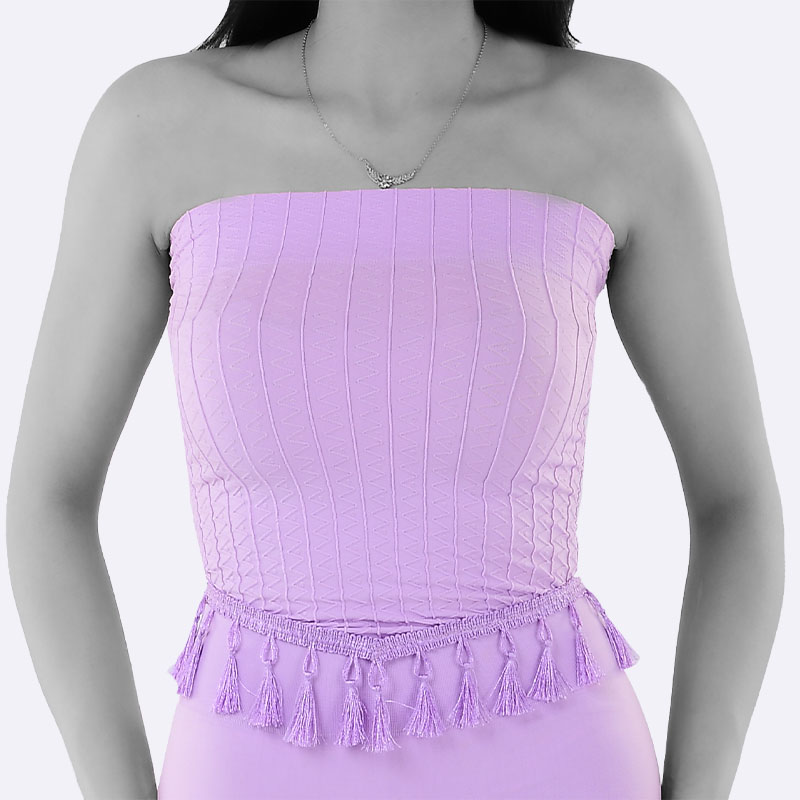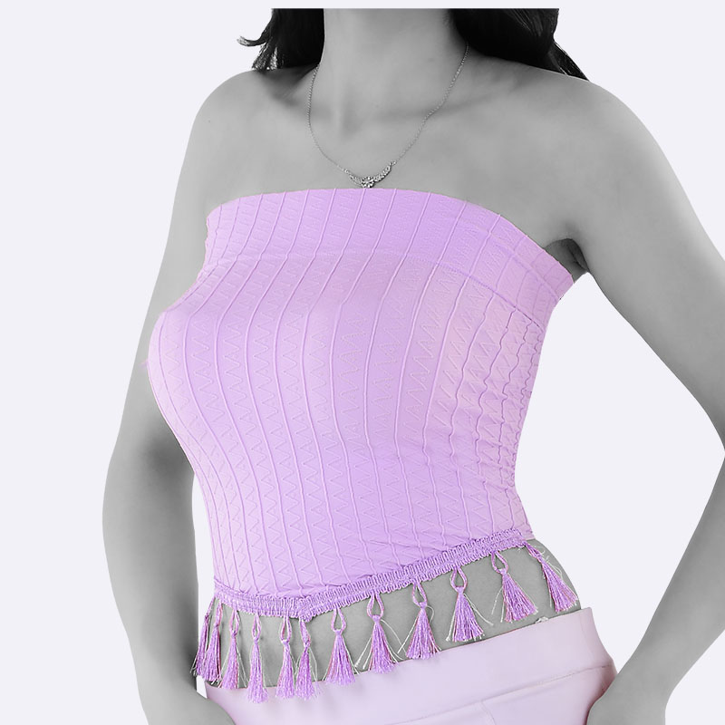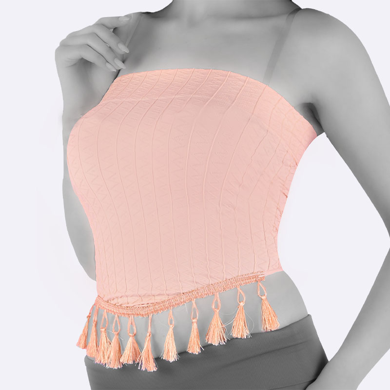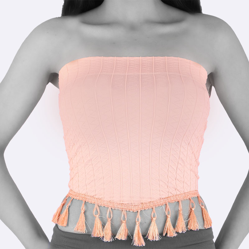 توب نسائي ضيق بدون حمالات (Tube Top / كات) بلون خوخي فاتح، يتميز بنسيج مضلع أو مزخرف أفقيًا، مع حافة سفلية مزينة بشراشيب طويلة.
