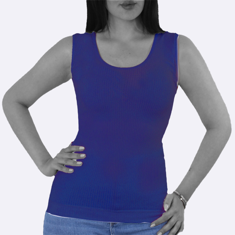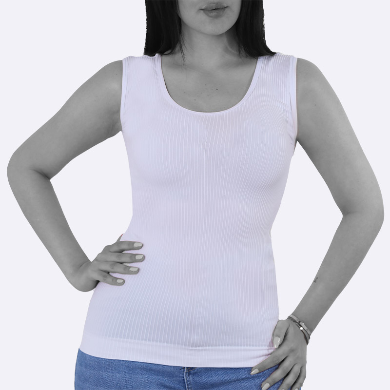 بلوزة أساسية بدون أكمام (حفر) ذات رقبة مستديرة واسعة، مصممة بخامة مضلعة (ريب) مطاطية، وقصتها طويلة تغطي الوركين تقريباً، ومناسبة للارتداء اليومي أو تحت الملابس.
