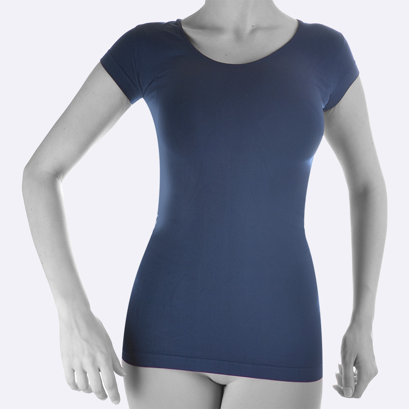 تيشيرت نسائي باللون الكحلي الداكن، بتصميم أساسي أكمام قصيرة وياقة دائرية، مصنوع من قماش ناعم ومريح بدون خياطة ظاهرة، مثالي للارتداء تحت الملابس أو بمفرده.