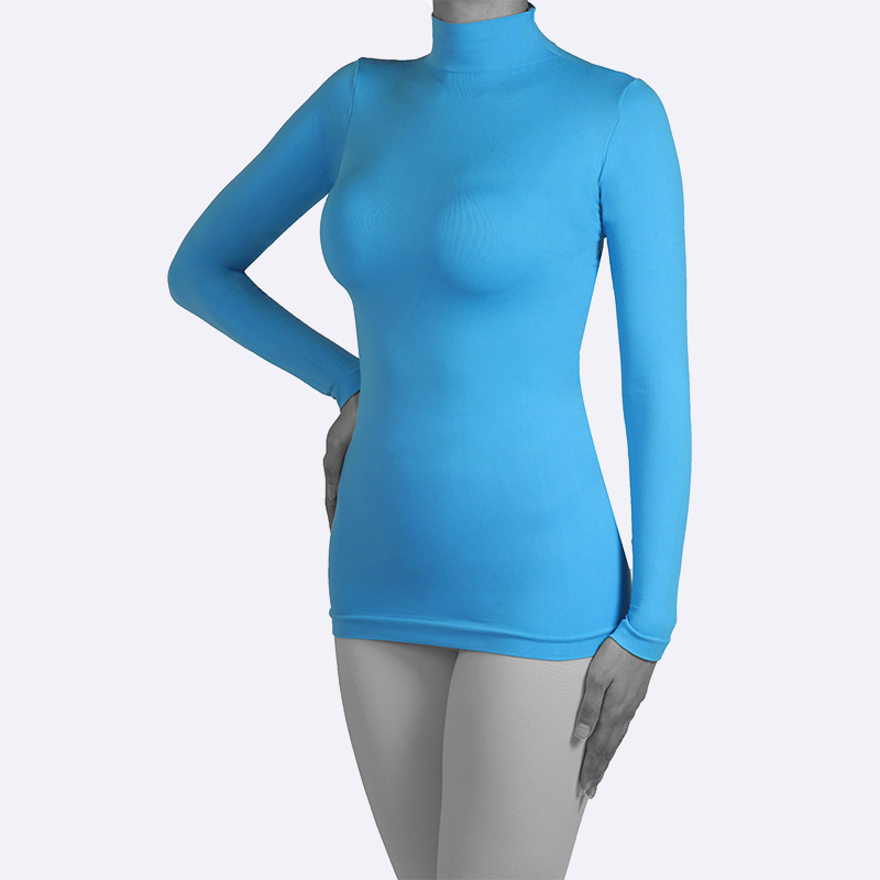 بلوزة نسائية ضيقة باللون الأزرق الفيروزي (السماوي)، تتميز بأكمام طويلة وياقة مرتفعة قليلاً (Mock Neck)، وهي قطعة أساسية ومريحة يمكن ارتداؤها تحت الملابس أو بمفردها.