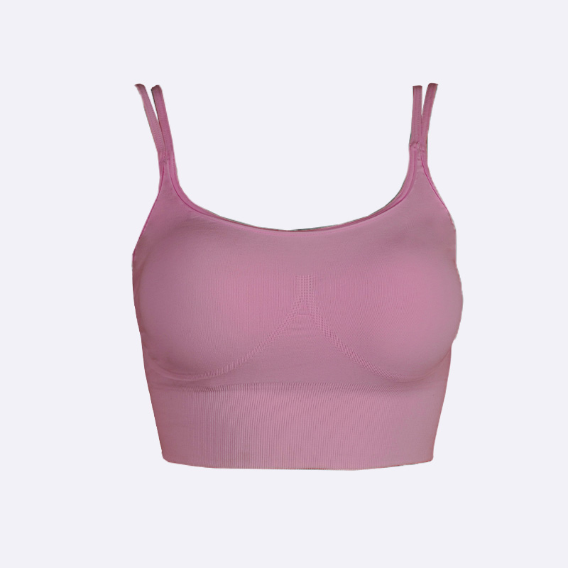 حمالة صدر نسائية باللون الوردي، مريحة وبدون درزات، تتميز بقصة طويلة نسبيًا (crop top) وشيالات كتف رفيعة ومزدوجة، مثالية للارتداء تحت الملابس أو في الإطلالات الصيفية الخفيفة