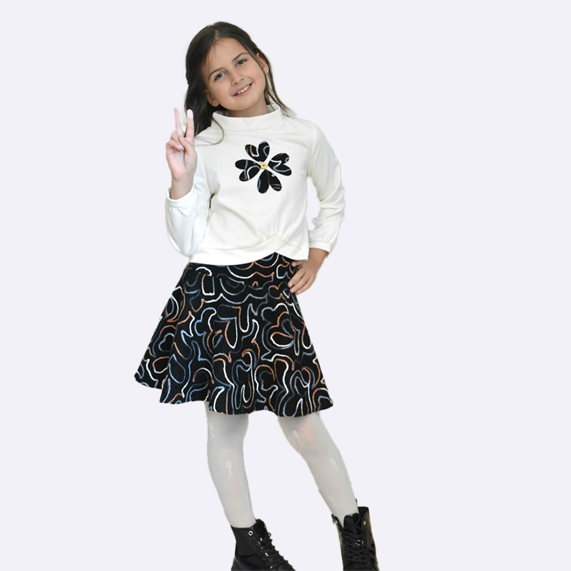 طقم بناتي عصري مكون من كنزة بياقة عالية وتفصيلة مطوية، مزينة بتطريز مركزي بسيط، وتفصيلة أكمام واسعة، مع تنورة قصيرة بكسرات ونقشة تجريدية متدفقة.
