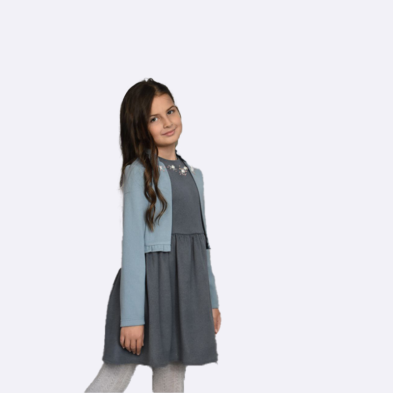 طقم رسمي بناتي مكون من فستان بقصة واسعة وحزام عند الخصر، مزين بتطريز على العنق، مع جاكيت قصير (بوليرو) بأكمام طويلة وتفصيلة مضلعة ناعمة.