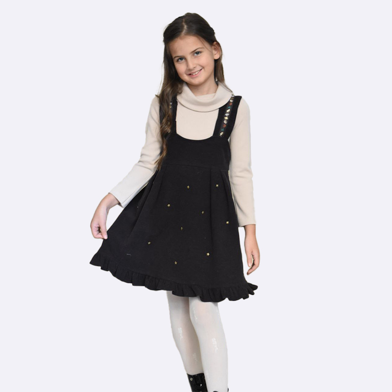 طقم أنيق يتألف من فستان مريلة (Pinafore Dress) قصير بحمالات وبتفاصيل مطرزة على شكل نجوم صغيرة، وتتميز الحافة السفلية بكشكشة ناعمة، يُلبس فوق قطعة علوية ذات ياقة عالية وأكمام طويلة، مما يوفر إطلالة شتوية جذابة.