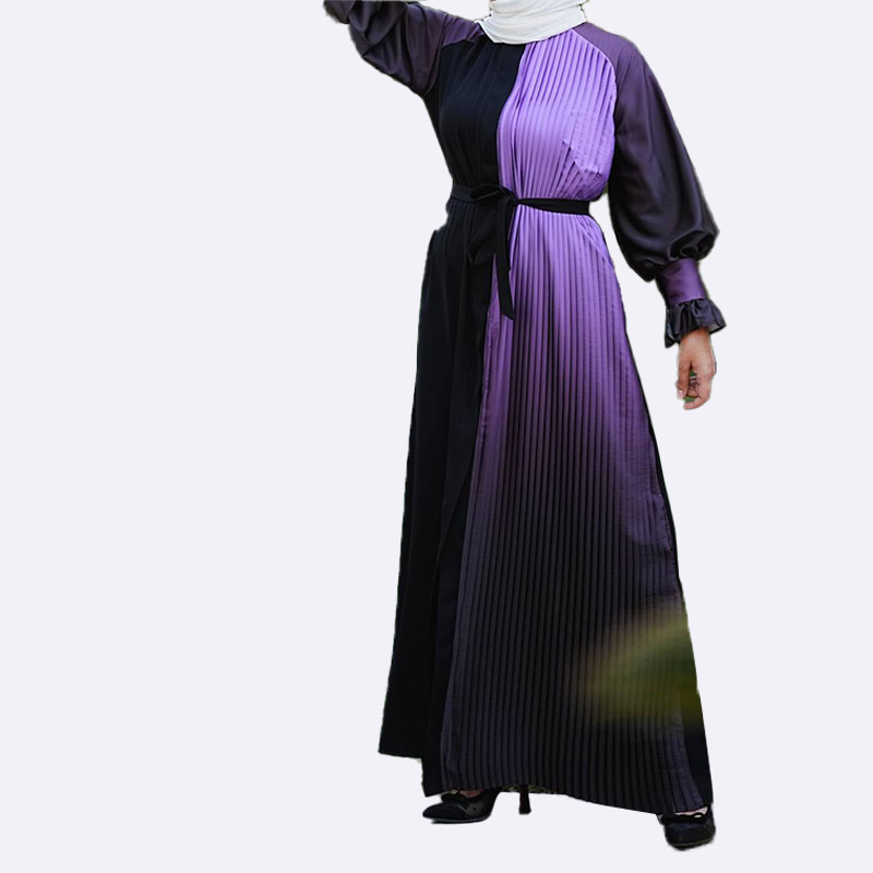 عباءة نسائية أنيقة بتصميم واسع بكسرات طولية، تتميز بتصميم نصفي بلونين مختلفين ومدمجين معًا، مع حزام للخصر لإبراز القوام.