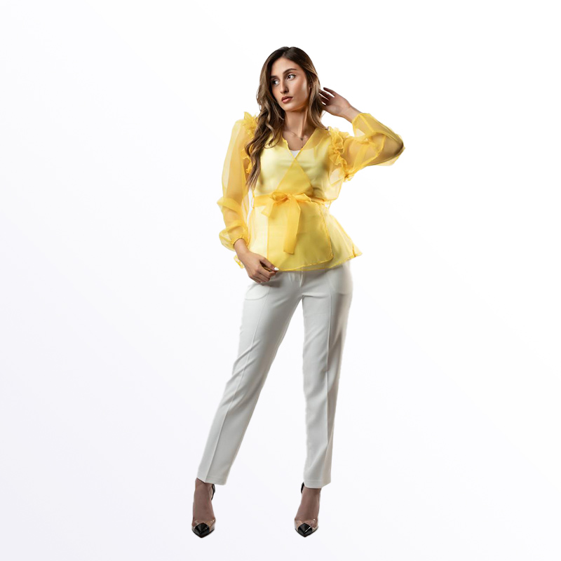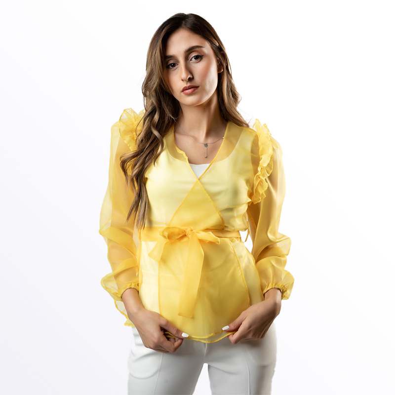 لوزة نسائية أنيقة بتصميم لف، مصنوعة من قماش شفاف ومتوفرة بألوان متنوعة تشمل الأبيض، الكيوي (الأخضر الفاتح)، الأزرق، والأصفر. تتميز بكشكشة (كَرانيش) على الأكتاف وحزام قماش لربطها عند الخصر لإطلالة عصرية وجذابة.