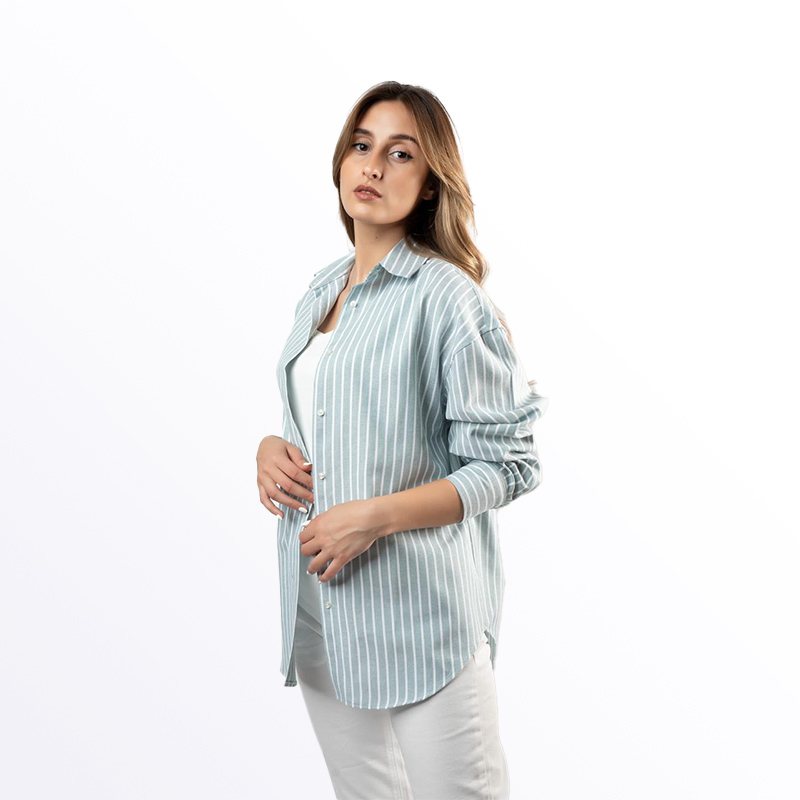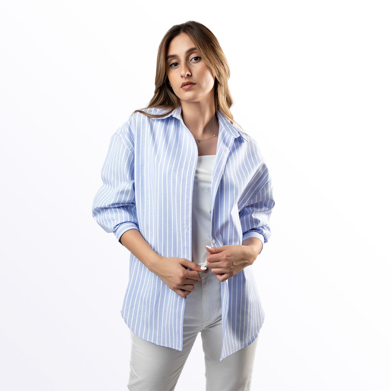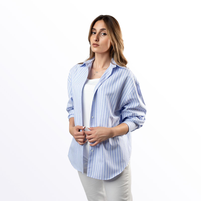 ميص نسائي أنيق بقصة فضفاضة ومخطط باللون الأزرق الفاتح والأبيض. متوفر بألوان إضافية تشمل الأخضر، البيج الفاتح، والأزرق. يمكن ارتداؤه مفتوحًا كسترة خفيفة أو مغلقًا لإطلالة كاجوال مريحة.