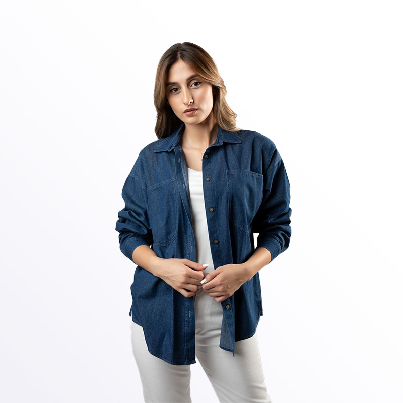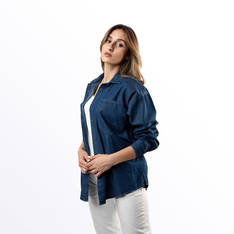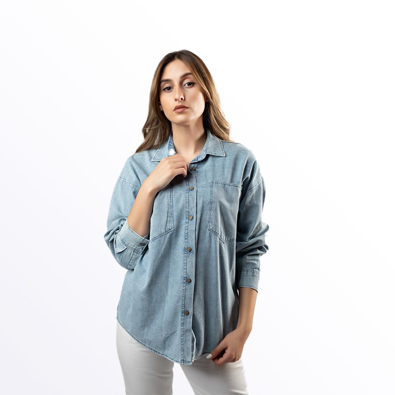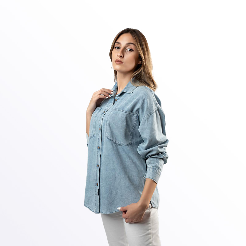 قميص نسائي من قماش الدنيم الأزرق الفاتح، بأكمام طويلة وياقة وأزرار أمامية وجيوب على الصدر. يتوفر بلونين من درجات الأزرق: الأزرق الغامق والأزرق الفاتح، مما يجعله قطعة مريحة وعصرية للإطلالات الكاجوال.