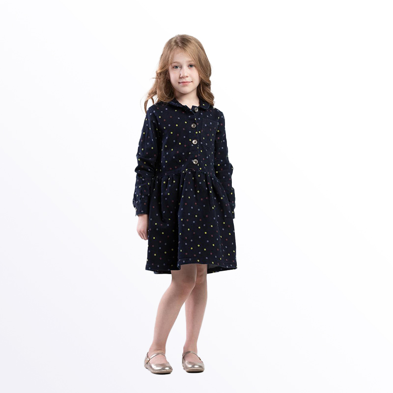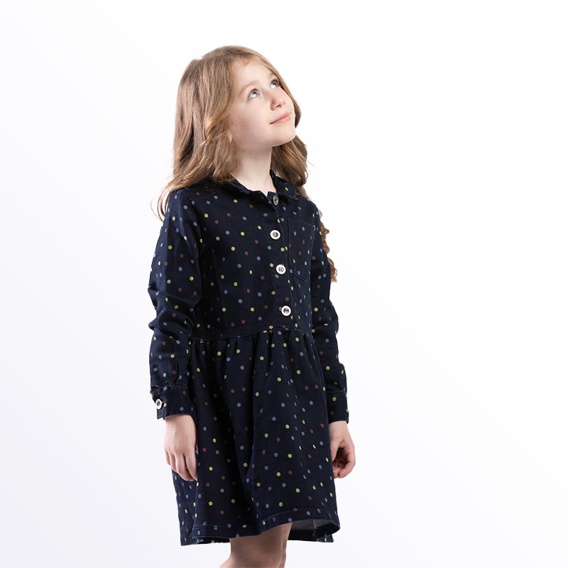 فستان بناتي باللون الكحلي المنقط بنقاط ملونة، بأكمام طويلة وياقة وأزرار أمامية. يتميز بقصة مريحة واسعة، مما يجعله قطعة أنيقة ومناسبة للارتداء اليومي.