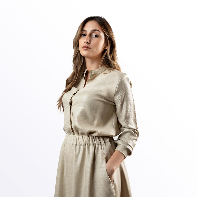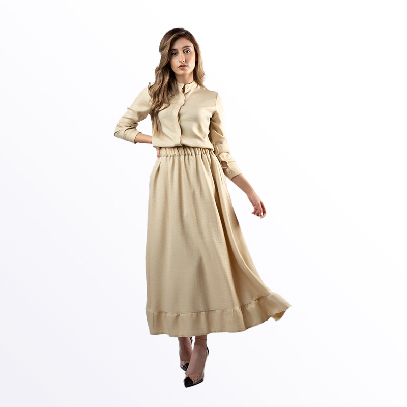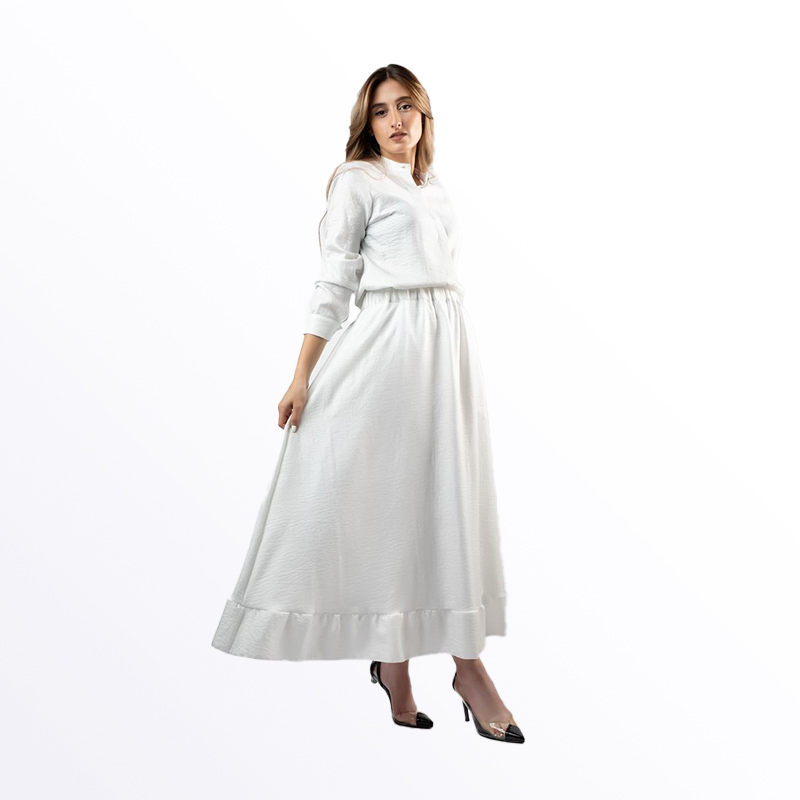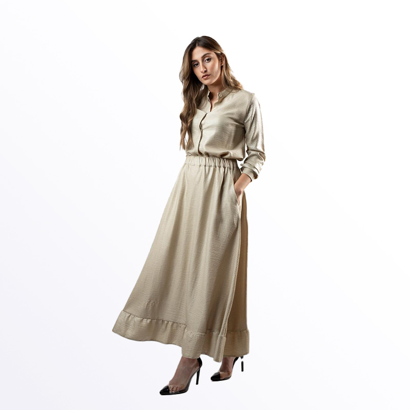 طقم نسائي أنيق مكون من كنزة وتنورة طويلة بقصة واسعة. يتميز بتصميمه الراقي وألوانه الجذابة مثل الأبيض، البيج الفاتح، الذهبي، والأخضر، مما يجعله خيارًا مثاليًا للمناسبات الرسمية والعائلية.