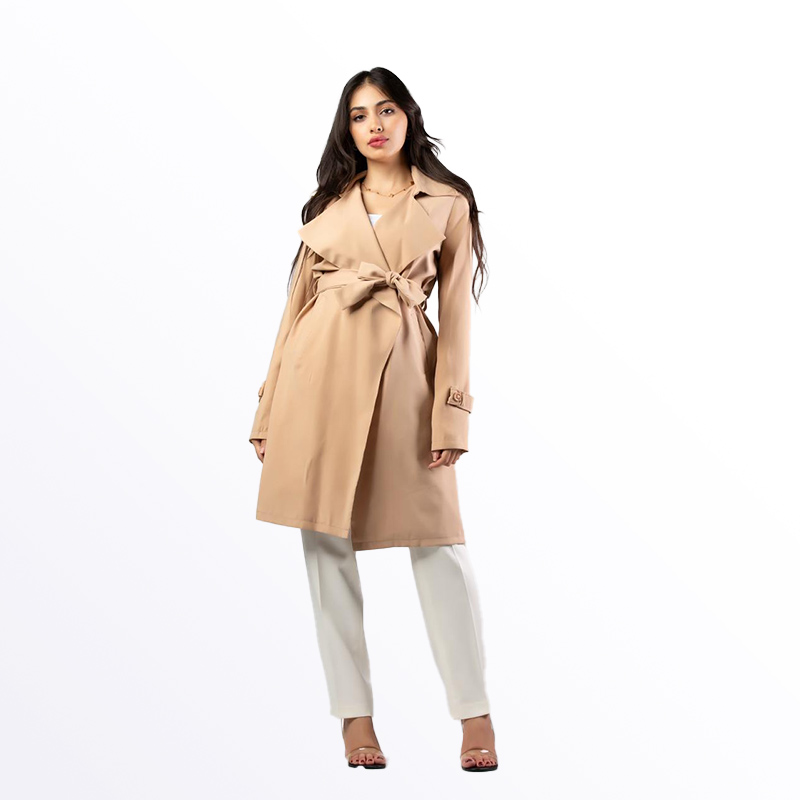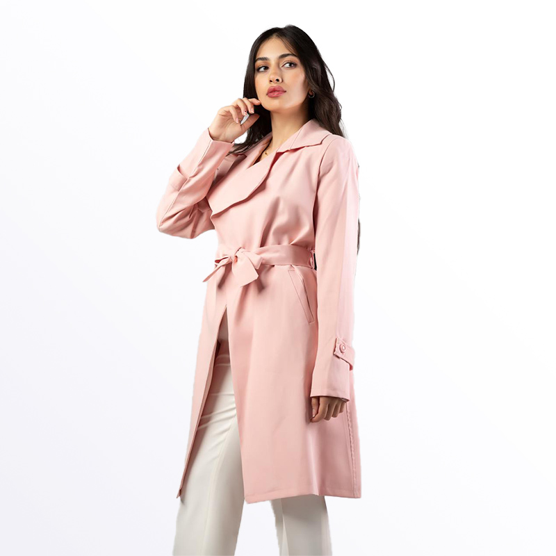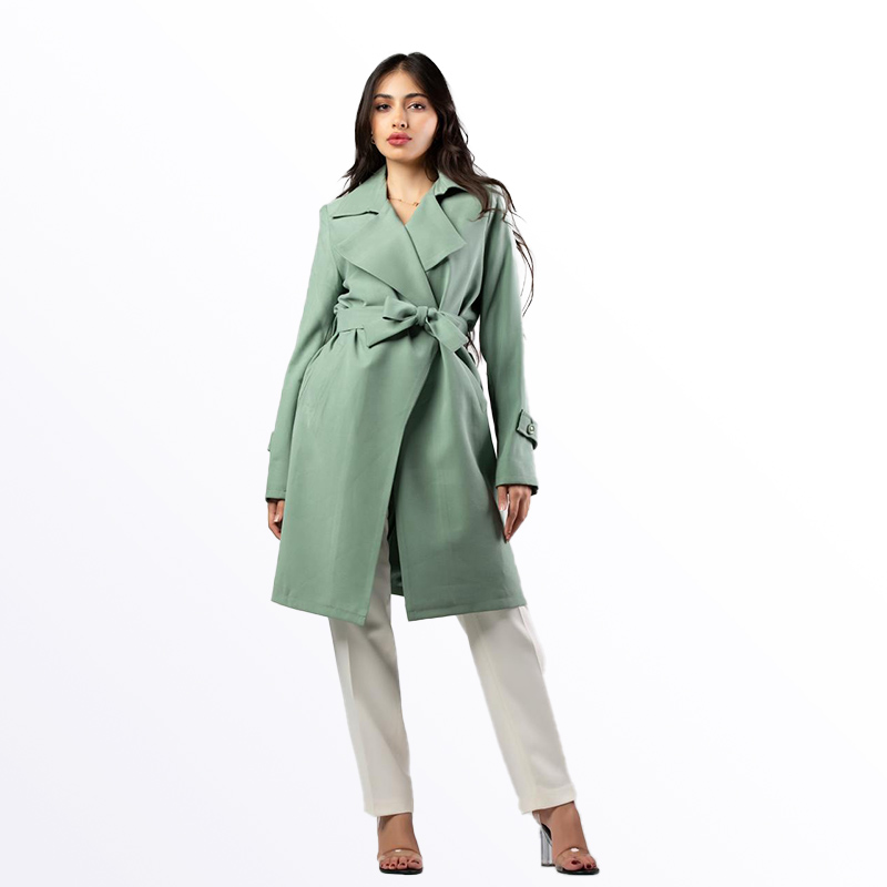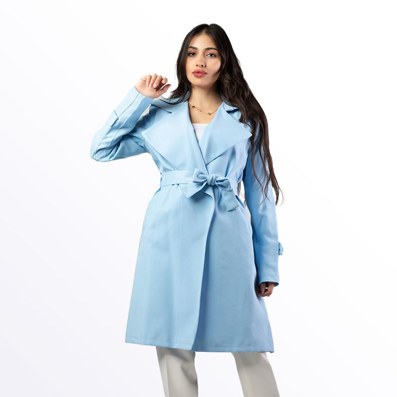 معطف نسائي أنيق بتصميم عصري ولون سماوي جذاب، يتميز بحزام على الخصر قابل للربط لإظهار القوام. يتوفر بألوان مميزة تشمل الأخضر، البيج الفاتح، الزهري الفاتح، والسماوي، مما يجعله قطعة أساسية للموسم الانتقالي.