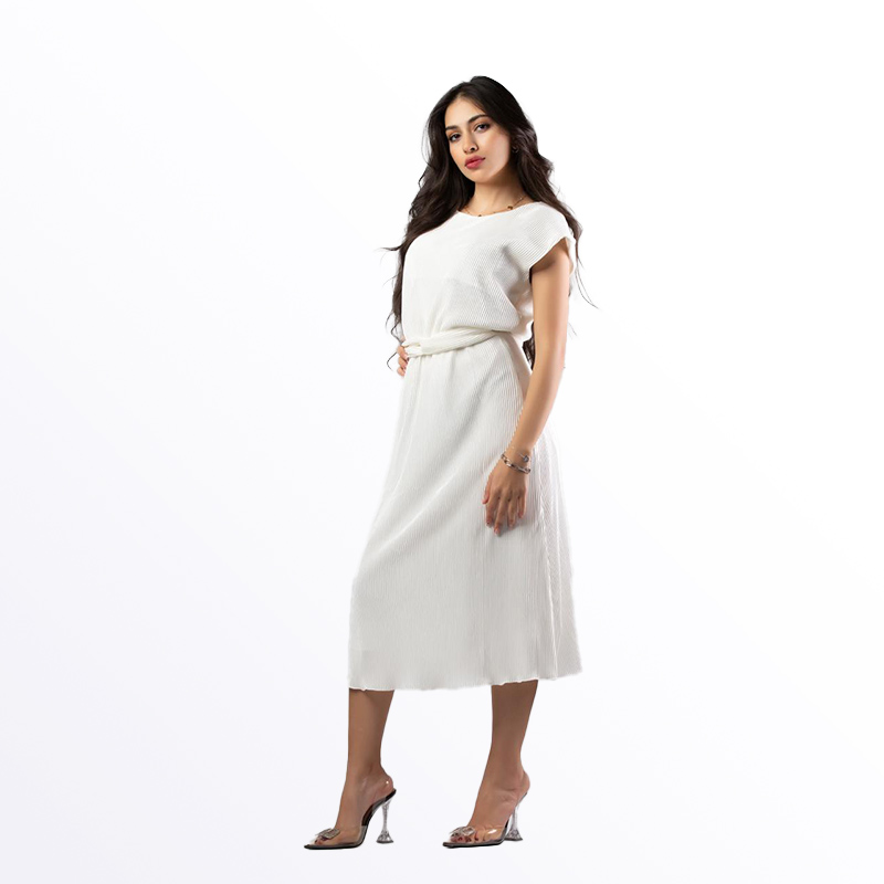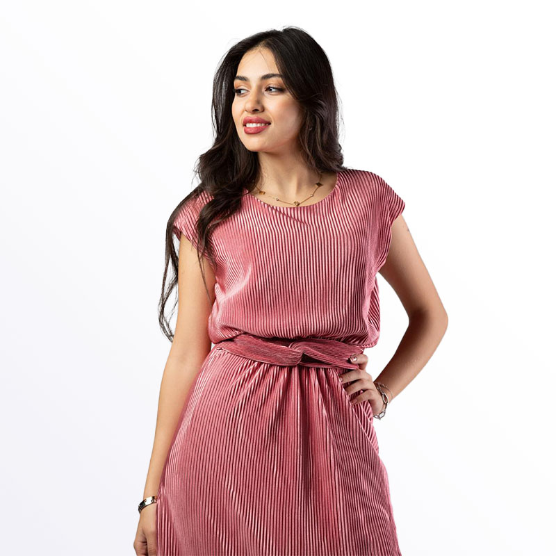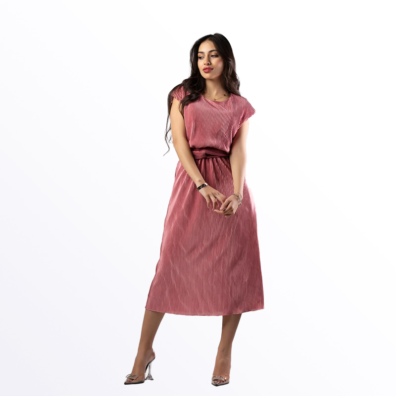 فستان سهرة نسائي بتصميم أنيق وقماش بليسيه، مزود بحزام قماشي عند الخصر لإبراز القوام. يتوفر بألوان جذابة تشمل الزهري الغامق، الأحمر، الأبيض، والفضي، مما يجعله خيارًا مثاليًا للمناسبات الخاصة والسهرات.