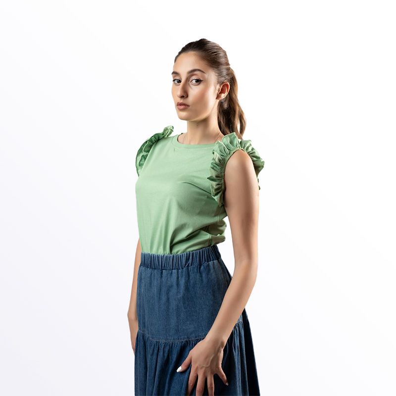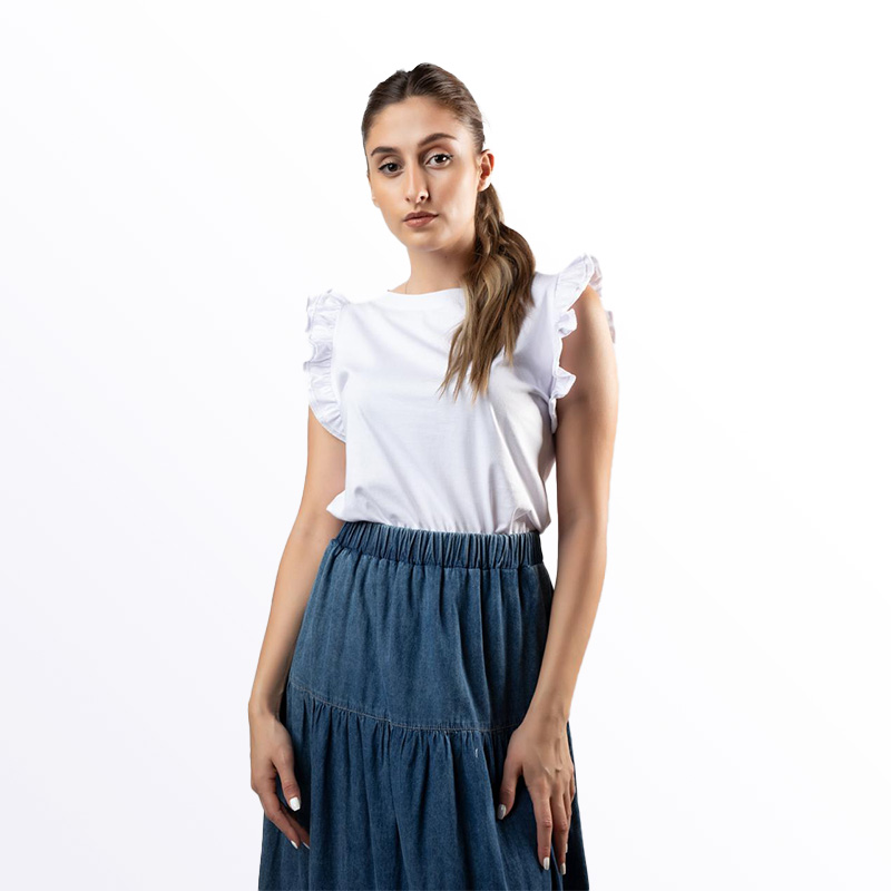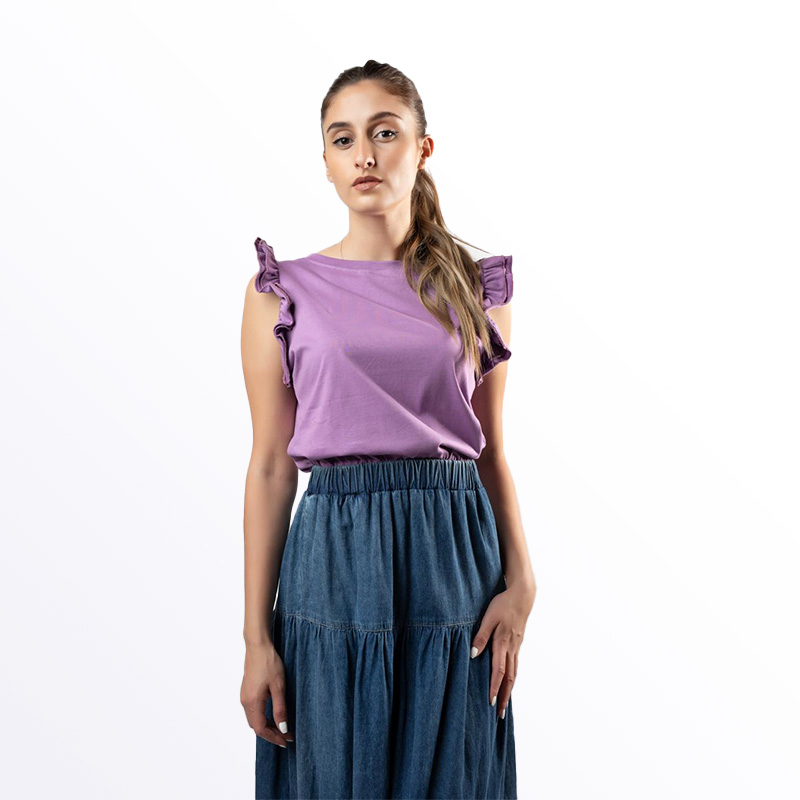 كنزة نسائية بلون موف فاتح، بتصميم عصري وأكمام مزينة بالكشكشة. تتوفر بألوان صيفية جذابة مثل الكيوي، الزهري الغامق، الموف، والأبيض، مما يجعلها قطعة مثالية للارتداء اليومي وإطلالات الصيف.