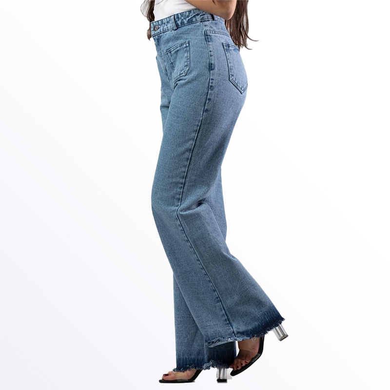 بنطال جينز نسائي بقصة واسعة على شكل جرس، ويتميز بخصر مرتفع وواسع، وجيوب أمامية كبيرة. يتميز بلمسة نهائية مفرّغة عند الأطراف السفلية، مما يجعله خيارًا عصريًا ومناسبًا للارتداء اليومي.