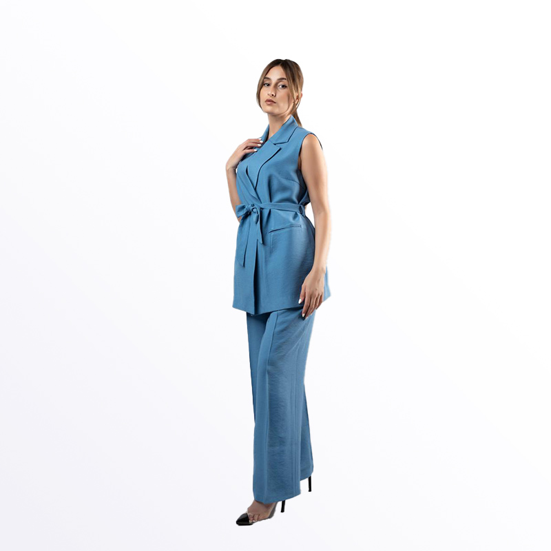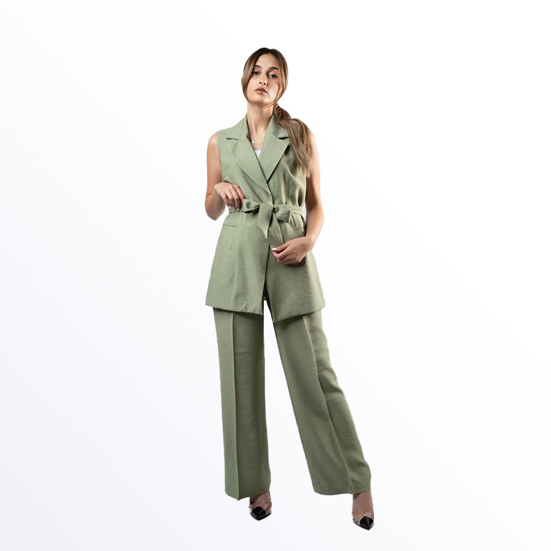 طقم رسمي نسائي مكون من جاكيت بدون أكمام وبنطال بقصة مستقيمة، بلون بيج غامق. يتميز الجاكيت بحزام قماشي عند الخصر قابل للربط، مما يجعله خيارًا أنيقًا وعصريًا للمناسبات الرسمية والعمل. يتوفر أيضًا باللونين البترولي والأخضر.