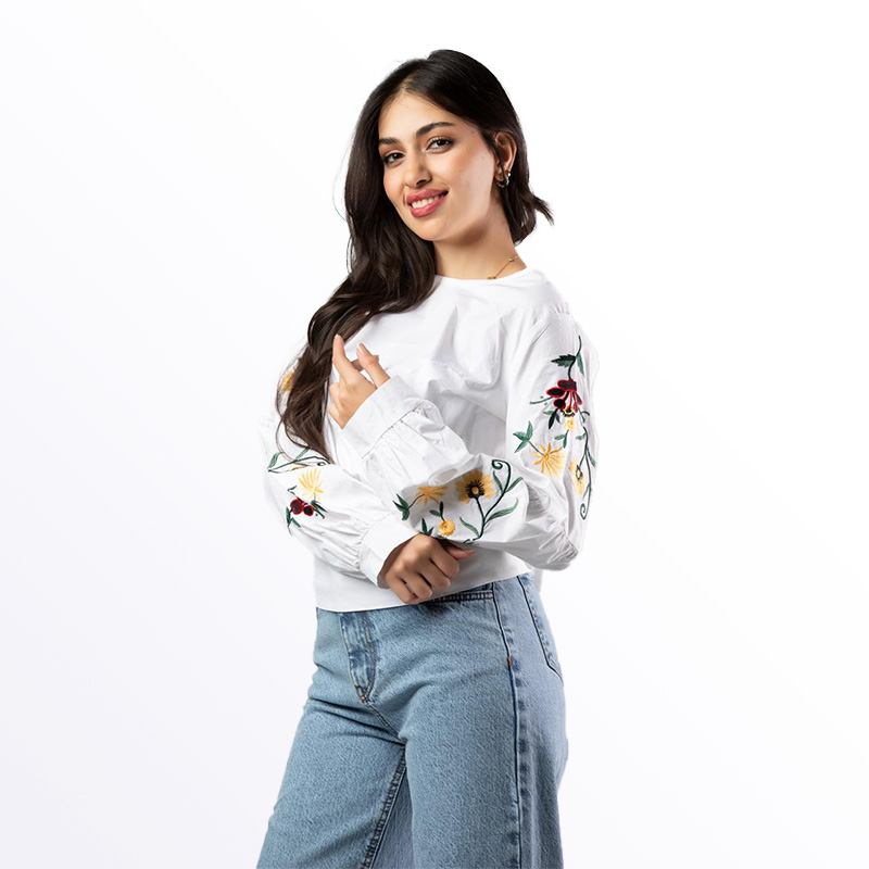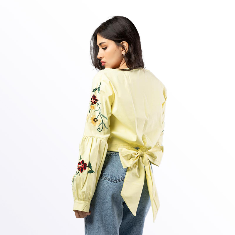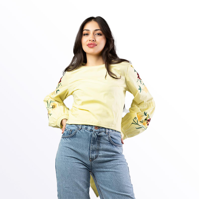 كنزة نسائية بتصميم عصري ولون أصفر فاتح، تتميز بتطريزات ملونة على الأكمام الواسعة. تتوفر بألوان صيفية أنيقة تشمل الأبيض والأصفر، مما يجعلها قطعة مميزة ومناسبة للإطلالات اليومية.