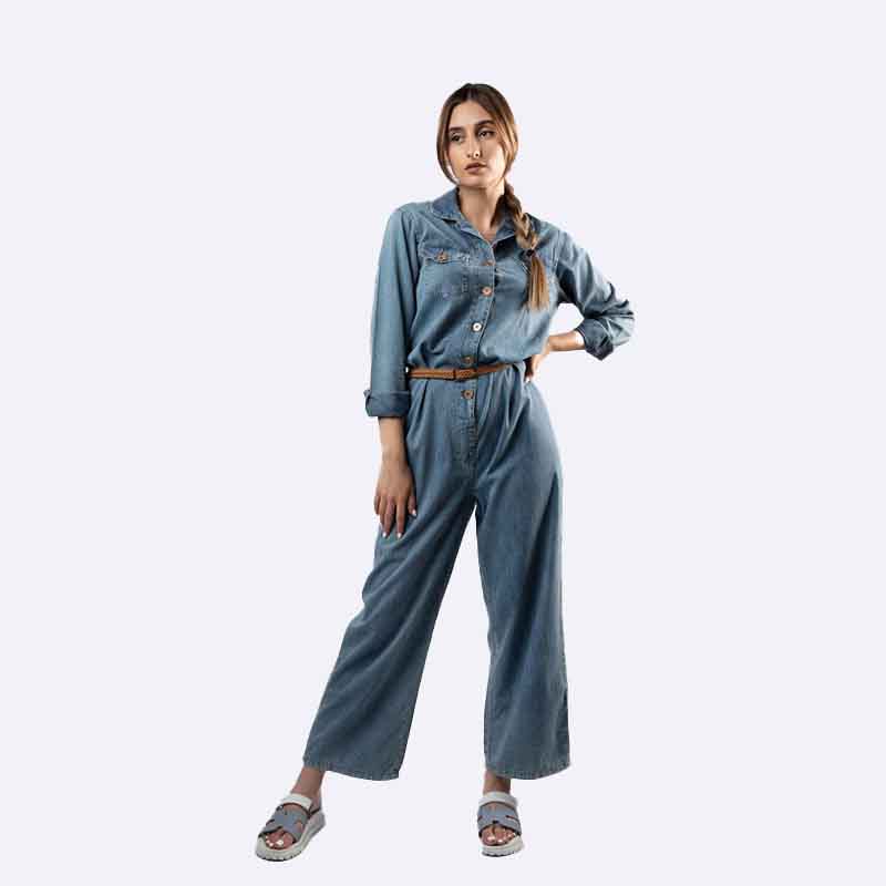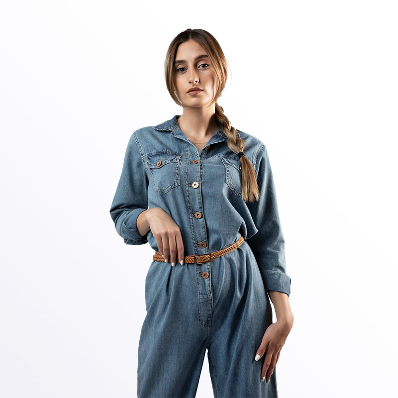 جمبسوت نسائي من قماش الدنيم، بتصميم عصري مزود بأزرار أمامية وحزام من الخوص على الخصر. يتميز بأكمام طويلة وقصة مريحة، مما يجعله خيارًا أنيقًا وعمليًا للارتداء اليومي.